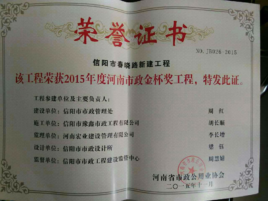 好風憑借力,送我上青云。近年來,公司積極參與城市市政基礎設施建設施工,積極參與市場競爭,先后承擔施工了市政府重點工程南京路道路改造工程、春曉路道路改造工程,東方紅大道道路改造工程、龍江東路新建工程等重點民生工程,其中南京路道路改造工程被省建設廳評為“中州杯”, 春曉路和東方紅大道道路改造工程被省建設廳評為“省優工程”,成為城區一道道亮麗的風景線。參與施工了市典范小區“臺北城上城”、“恒大名都”以及師范學院、職業技術學院、交警支隊和軍區道路工程,參與施工了雞公山管理區、南灣管理區、明港鎮和羅山縣等部分道路小區工程施工,累計大小各類施工工程三百余項,企業影響力不斷擴大、輻射力不斷增強,市場份額不斷提高,企業信譽不斷彰顯,為信陽城市建設做出了積極貢獻,為企業的可持續發展插上了騰飛的翅膀。